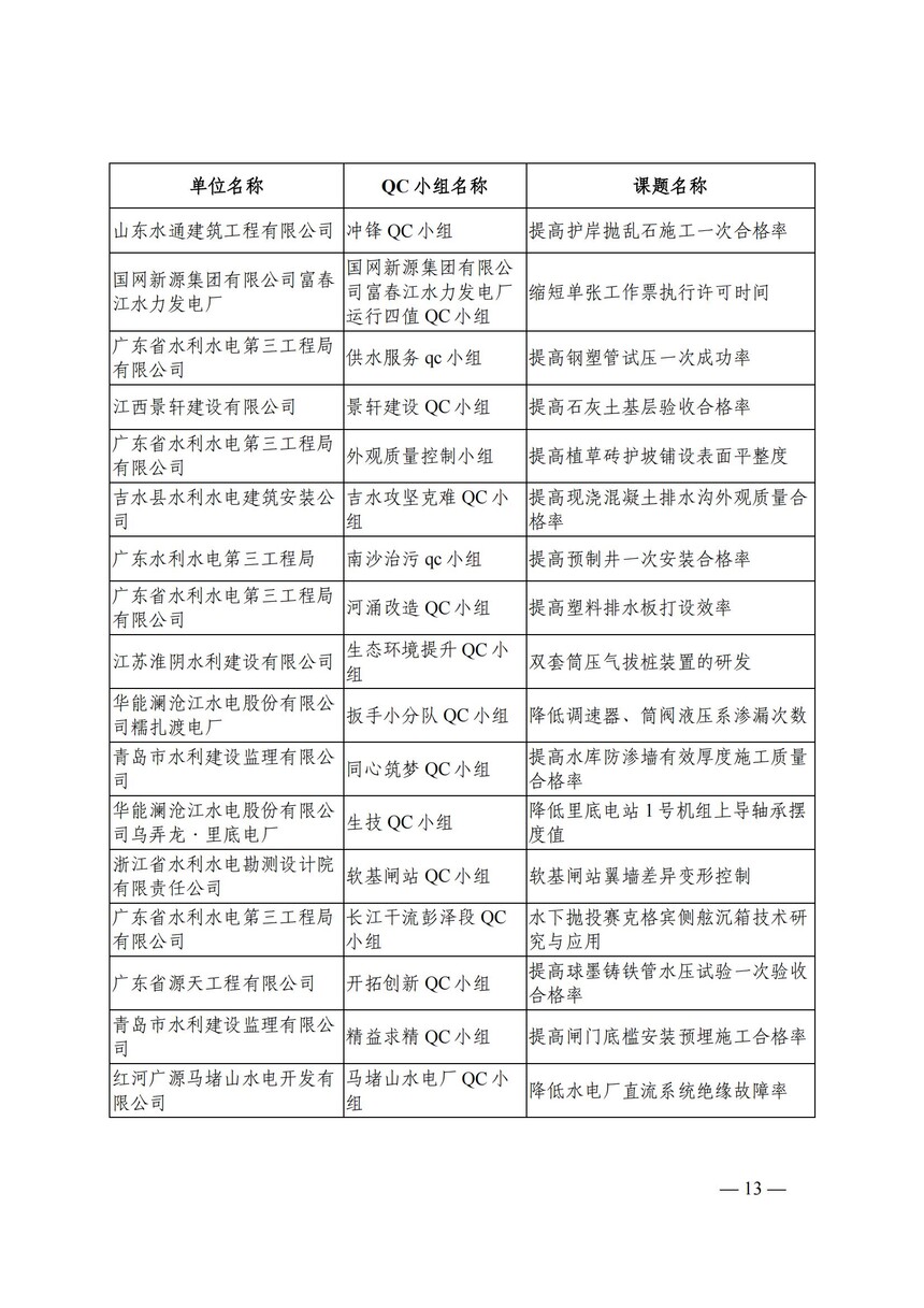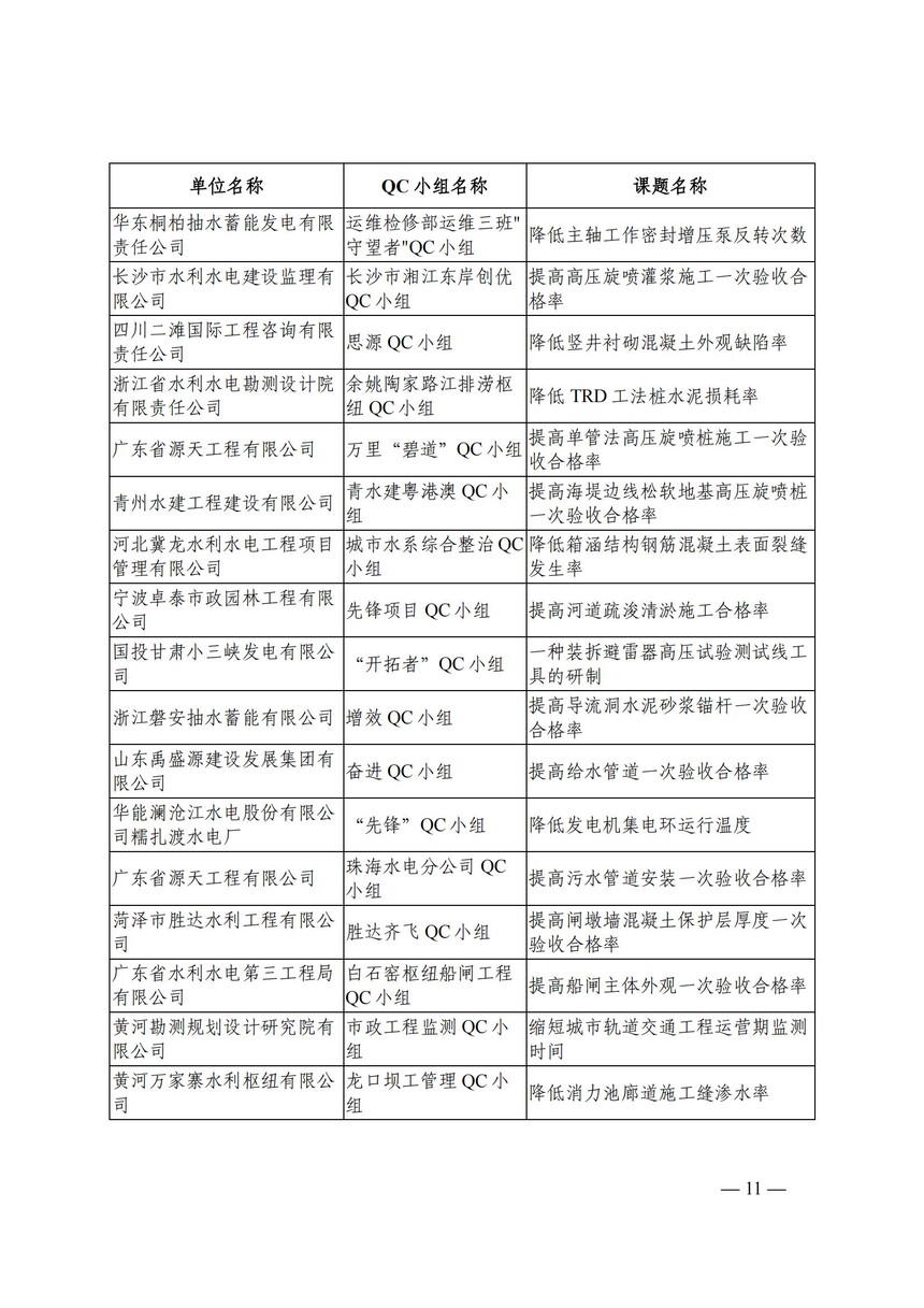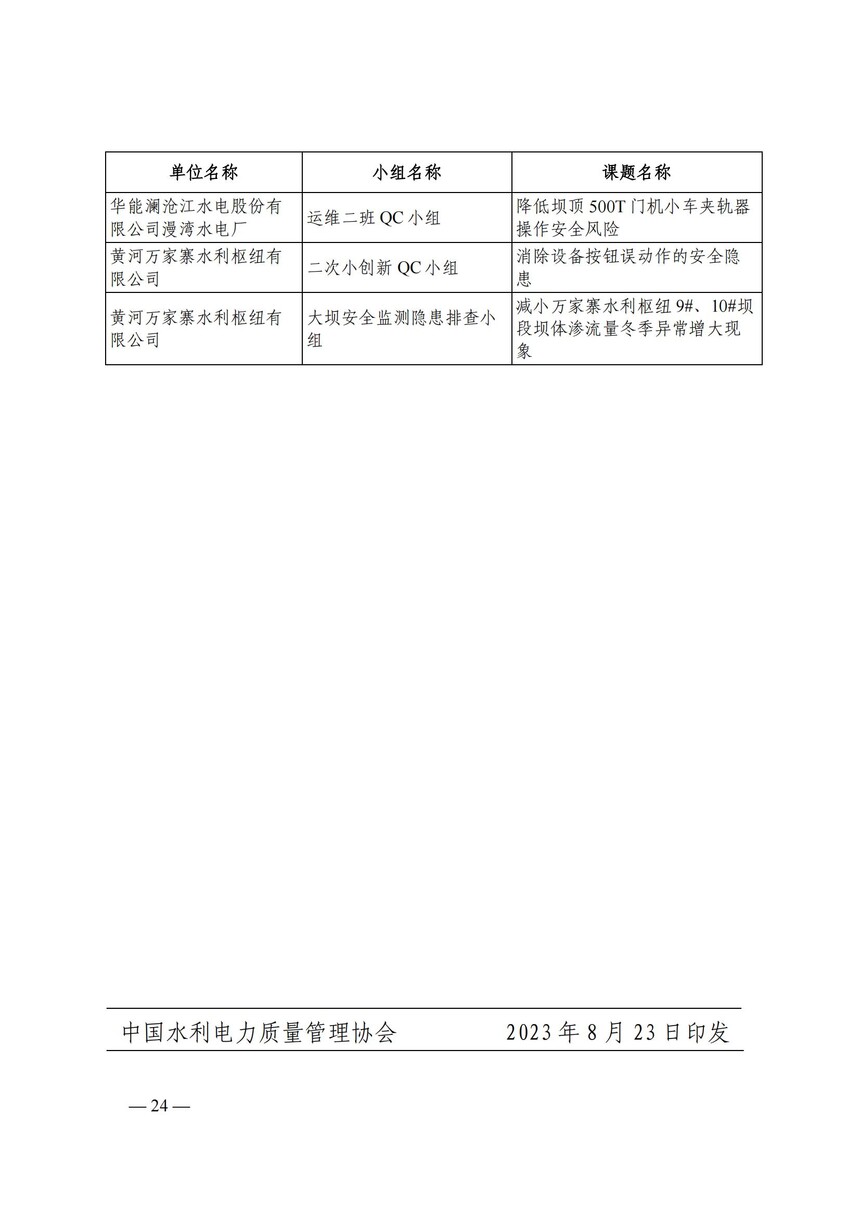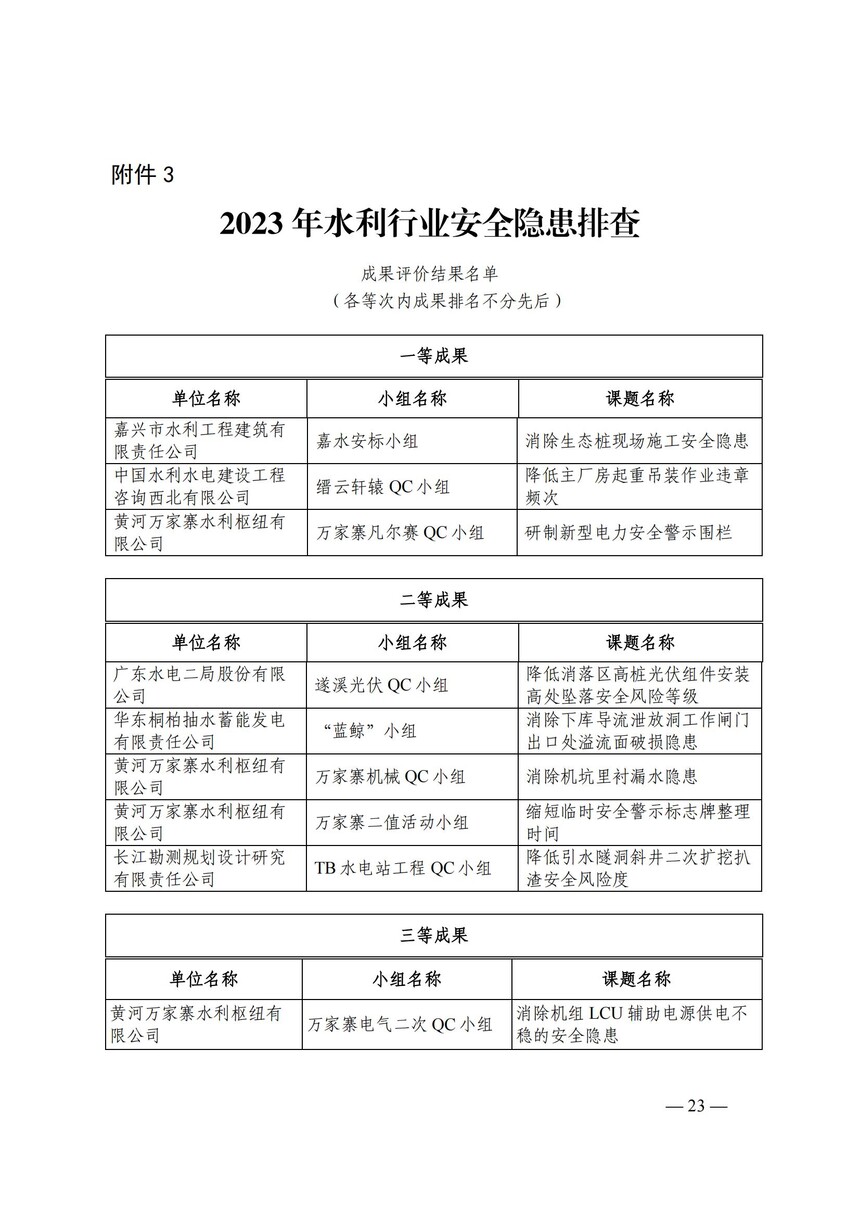 2023 年水利行業質量管理小組活動 成果交流評價結果名單